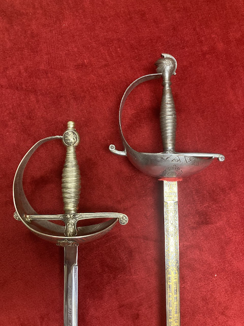 | Dos modelos de Espada para Oficial Superior del Real Cuerpo de Guardias Alabarderos modelo 1848/1875, fechadas en Toledo en 1879 y 1882 respectivamente. Obsérvese las distintas calidades de factura. |